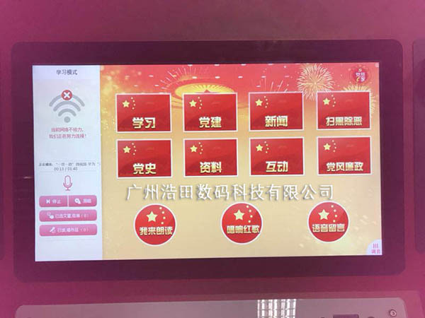 廣州浩田有限公司為機(jī)關(guān)單位訂購的紅色朗讀亭,并通過紅色學(xué)習(xí)朗讀亭以“紅愛國”“黨建”“掃黑除惡”“黨風(fēng)廉政”為主題,將朗讀與紅色教育碰撞火花。紅色學(xué)習(xí)亭整體機(jī)身采用紅色,與黨和國家的主題相符合。內(nèi)容圍繞黨史/黨風(fēng)廉政/新聞/學(xué)習(xí)等多方面進(jìn)行。