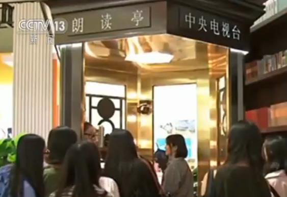 在展廳,中央電視臺《朗讀者》欄目的線下體驗專區(qū)“朗讀亭”外每天都會排起長隊。