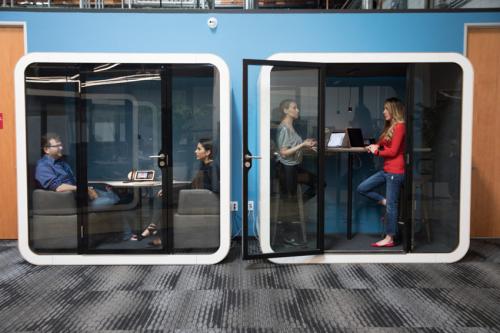 隱私倉采用90%的冷軋鋼制造,整體外觀造型顯得很年輕、時尚,顏色也是可以隨意搭配不同主題的裝修風(fēng)格,建成后可隨時移動至辦公空間的任何角落;而在隱私性保護方面,隱私倉可對辦公場所中的各種聲音(包括電話、談話及咳嗽等)作出一定程度的隔離,而隱私倉內(nèi)的聲音較難傳出艙外,以保證員工私密性需求。