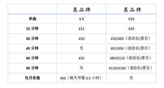 北京地區(qū)部分單曲收費(fèi)8元,15分鐘收費(fèi)20元、30分鐘38元、60分鐘58元。也有單曲收費(fèi)為8元,分時(shí)段收費(fèi)15分鐘為25元、28分鐘36元、38分鐘42元、48分鐘48元、58分鐘55元。